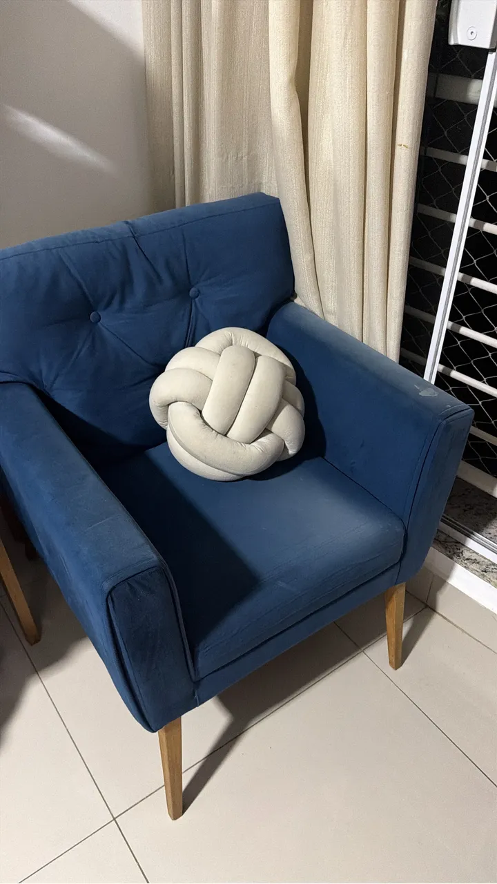 Poltrona azul. Pequenas marcas brancas na lateral. Apenas sujeira no braço. Pequenas marcas de uso. Bem resistente e confortável