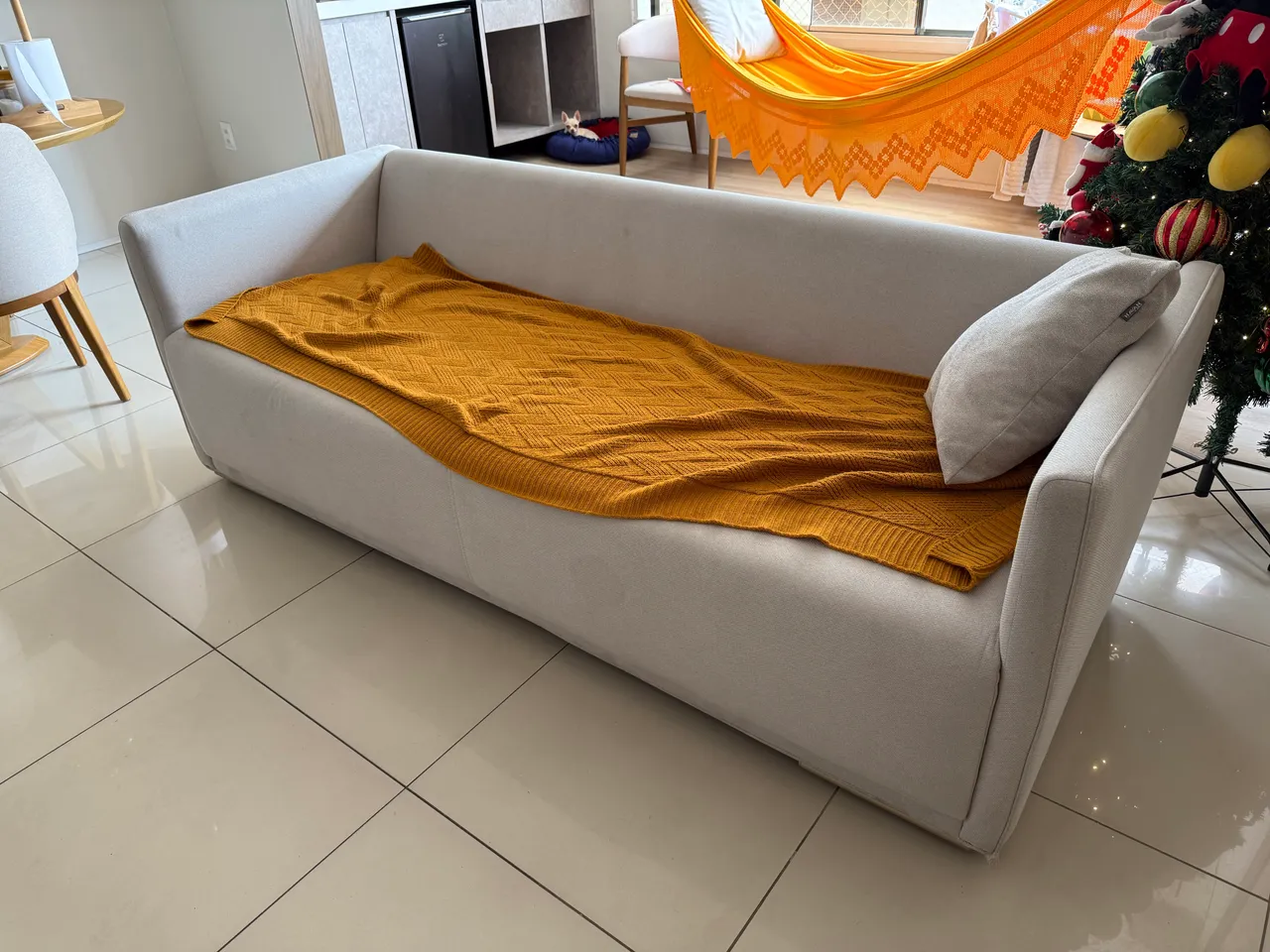 Sofá de linho com apenas 1 ano de uso e dimensões 2,08m x 83 cm x 72 cm